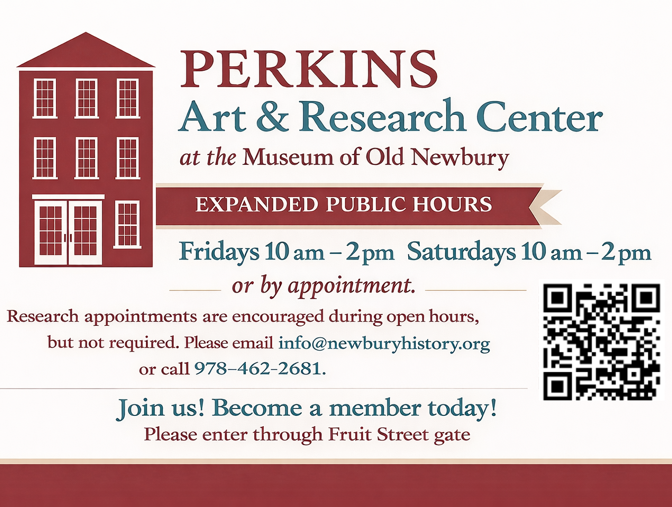 The Museum of Old Newbury and Perkins Art & Research Center will be closed on February 7th, 2026 due to the weather.