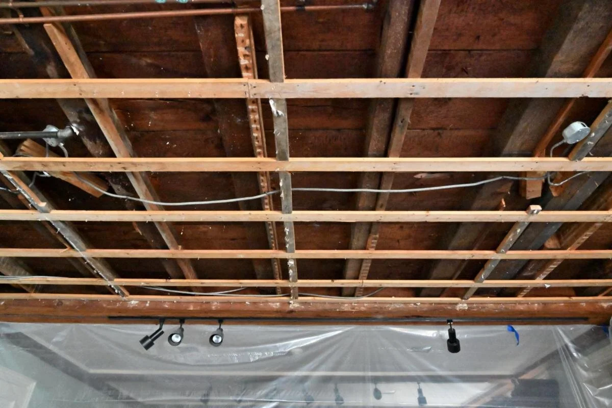 The work, undertaken by Morrill Electric of Amesbury, began in late April. These photographs taken by photographer and board member Bob Watts show the demolition of the ceiling in the basement lecture hall that will allow access to the wiring for that level and the first floor of the house.