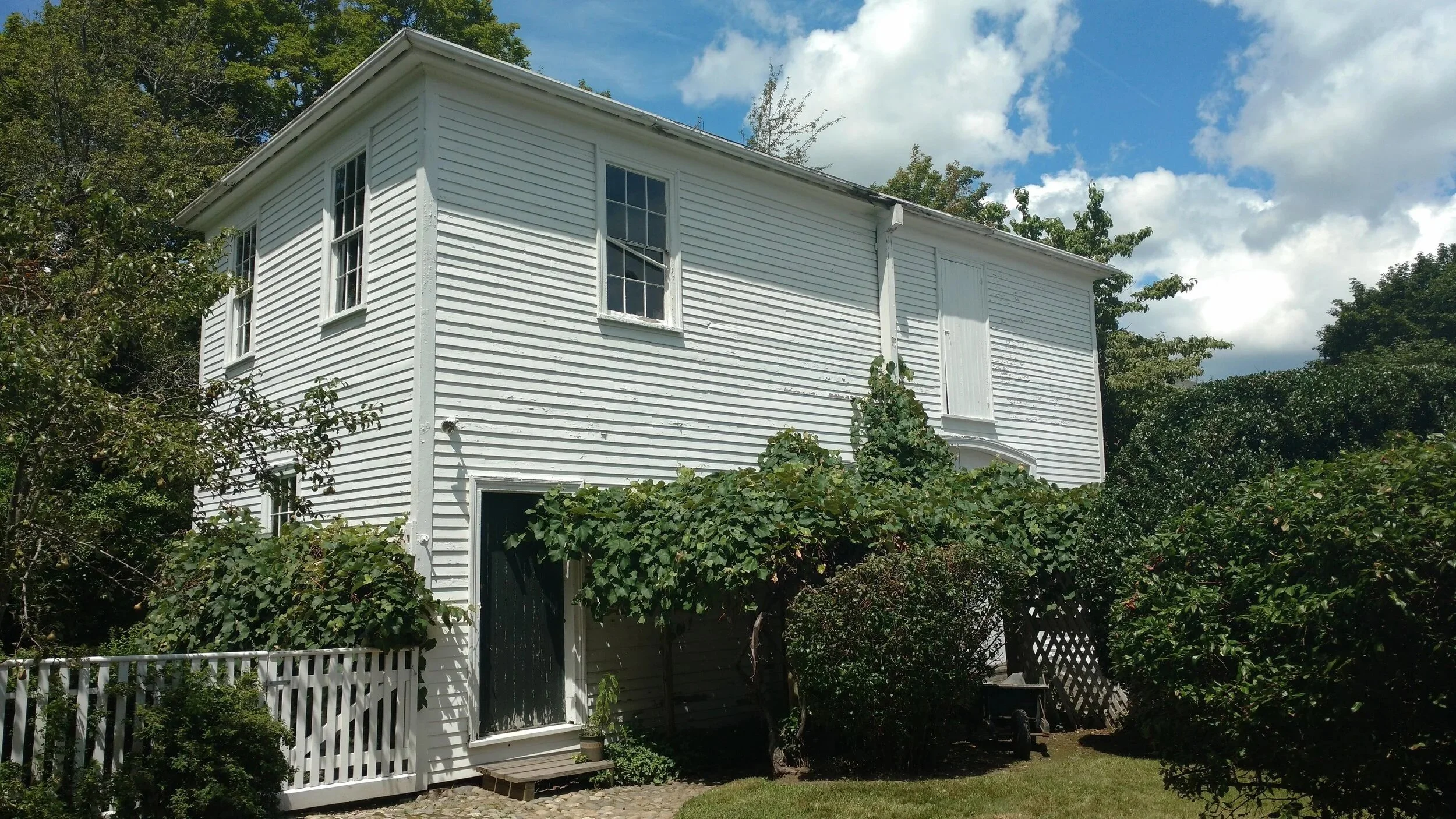 The privy, located behind the main house, dates from approximately 1860. Part of the building served as an outhouse, while the rest was used as a workspace, primarily for laundry. A nearby pump supplied water for laundering, and drilled holes in the building’s original two-inch thick floorboards ensured proper drainage. Laundry lines were strung between cleats on the exteriors of the privy and the main house.